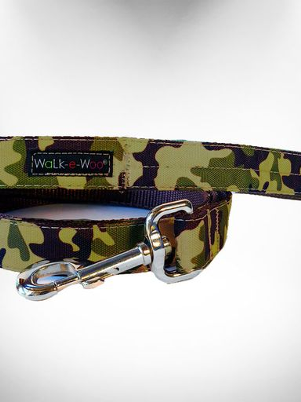 Available with brown webbing or hot pink.We construct our collars withfour goals: performance,comfort, style and durability.Made of soft, strong, breathable nylon webbing, Walk-e-Woo's exclusive designs are printed on durable fabric that resists water and dirt. We've added contoured, quick-release buckles so your pup has extra comfort and safety whether you're out duck hunting or bargain hunting. Our extra durable reinforced nylon thread means many years of wear without wearing out, and the nickel-plated steel D-ring will proudly display your dog's credentials.Care instructions: Wipe dog collar with damp cloth for minor clean up or machine-wash in netted bag. Hang dry.Guaranteed 100%. We love dogs and want your dog to have a stylish, good fitting dog collar. Return or exchange for any reason.