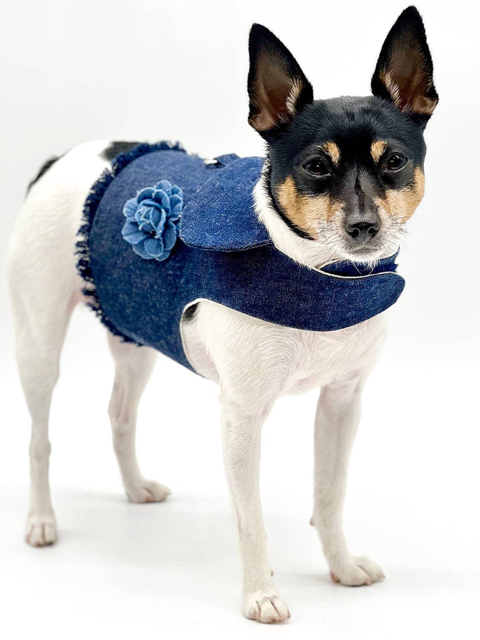 NEW!Denim Flower Harness Vest with fringe detail. Made from a 100% cotton denim with a white cotton lining. This vest is adjustable with Velcro straps around the chest and belly for easy on and off. D-ring for leash. Machine washable on gentle cycle, lay flat to dry. Sizes XXS, XS, SM & MD. * Easy Velcro On and Off. * Machine washable. Machine wash on gentle cycle with cold water, lay flat to dry. * Comes in XXS, XS, SM, and MD.