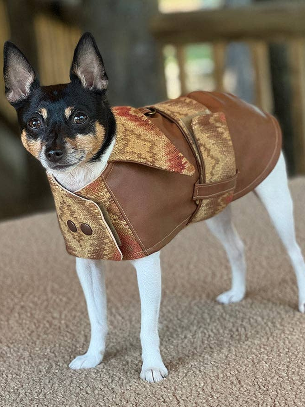 NEW! Made from a Vegan Brown Faux Leather and Faux Suede lining with a Southwest print detailing on collar, chest and belt. This coat is adjustable with Velcro straps around the chest and belly for easy on and off. Sizes XXS and XS have a D-ring for leash, sizes Small and Medium have a hole on the back for your harness ring to slip through. Spot clean when necessary. Sizes XXS, XS, SM & MD. * Easy Velcro On and Off. * Comes in XXS, XS, SM, and MD.
