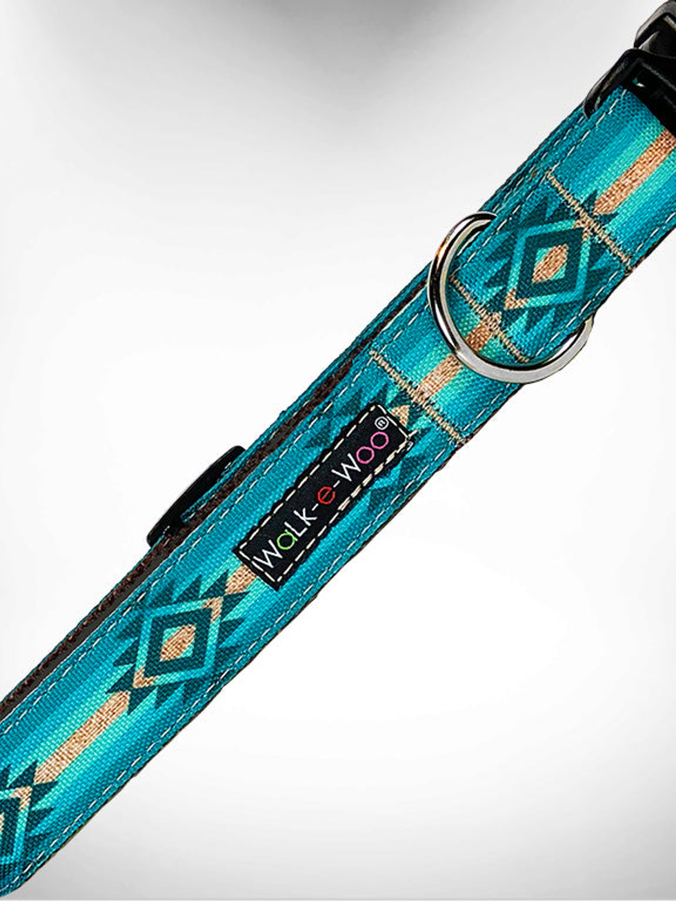 Southwestern style packs a whole lot into one design genre! The iconic look of the Wild West, desert landscapes and rich American Indian symbolismall brought together in our original new styles. Modern, fresh and vibrant with tons ofcharacter!We construct our collars withfour goals: performance,comfort, style and durability.Made of soft, strong, breathable nylon webbing, Walk-e-Woo's exclusive designs are printed on durable fabric that resists water and dirt. We've added contoured, quick-release buckles so your pup has extra comfort and safety whether you're out duck hunting or bargain hunting. Our extra durable reinforced nylon thread means many years of wear without wearing out, and the nickel-plated steel D-ring will proudly display your dog's credentials.Care instructions: Wipe dog collar with damp cloth for minor clean up or machine-wash in netted bag. Hang dry.Guaranteed 100%. We love dogs and want your dog to have a stylish, good fitting dog collar. Return or exchange for any reason.